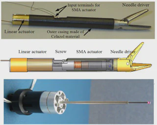 Design of the robotic mechanisms for minimally invasive surgery is one of the thrust areas of our research. In addition to the development of a tele-surgical robotic system for beating heart surgery (described above), our research also focuses on development of miniaturized actuation and sensor systems that can be used as enabling technologies for robotic systems for minimally invasive surgery. Examples include, an integrated hybrid actuator system that combines shape memory alloy and DC motor actuators, and a whisker sensor to detect the relative motion between the surgical instrument and the heart.